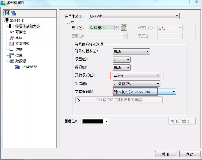 2. 双击该二维码,在弹出的条形码属性中,选择显示“符号体系和大小”选项卡,更改“开始模式”为“二进制”;